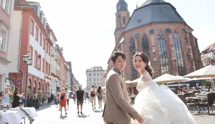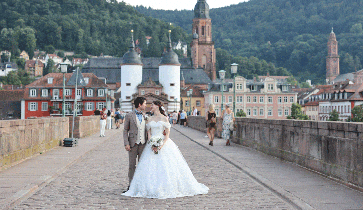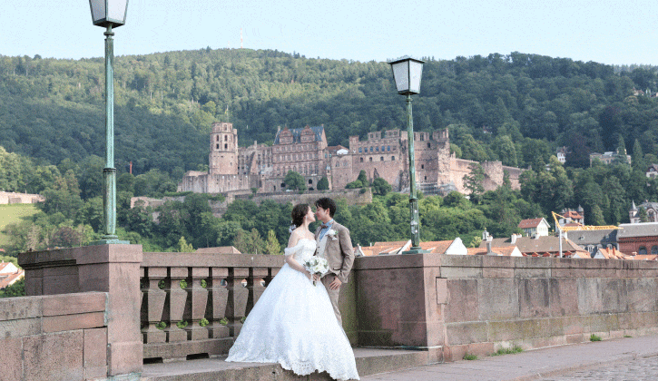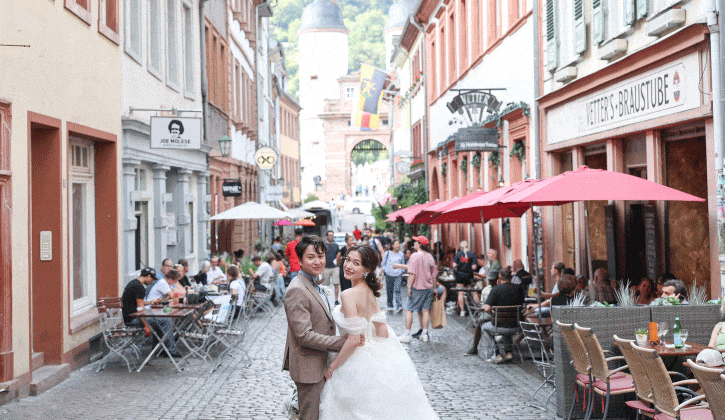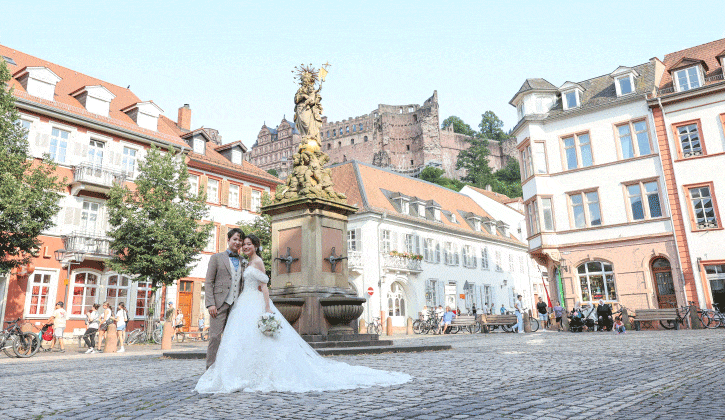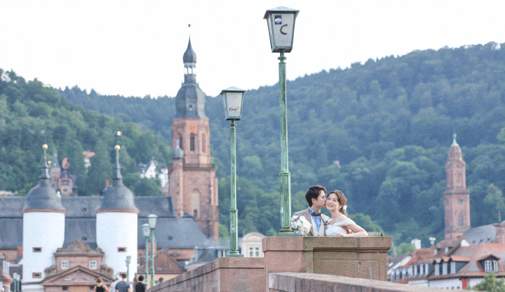 世界的に有名なハイデルベルク城を背景に、石畳の街並みやネッカー川沿いの美しい景観で撮影を楽しめます。