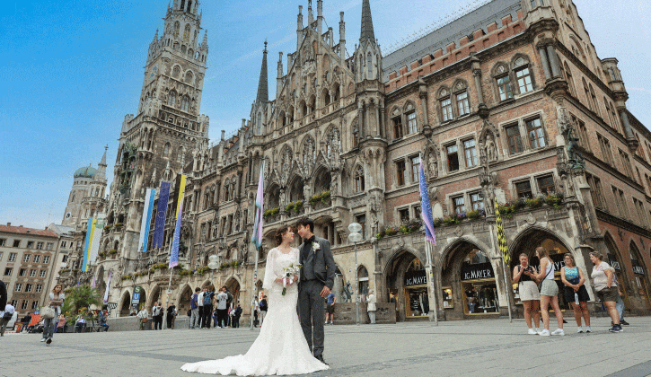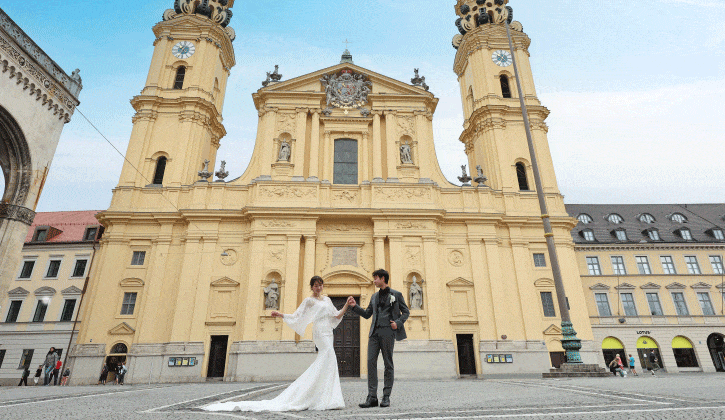 ミュンヘンは、南ドイツの中心都市で、フランクフルトと並ぶ国際線の玄関口。ドイツ旅行では、前半または後半に訪れる人が多い人気の街です。ミュンヘン市街地フォトウェディングとは、中世の面影を色濃く残す旧市街を舞台に、ヨーロッパらしい街並みの中で特別な一日を形にする撮影スタイルです。赤レンガ屋根が連なる温かな風景や、石畳が続くクラシカルな街角、そして歴史建築が建ち並ぶマリエン広場など、南ドイツならではの落ち着きと芸術性が溶け込んだロケーションが魅力。パリやウィーンの華やかさとはひと味違う、どこか親しみやすい雰囲気が多くのカップルに支持されています。映像としても非常に映える街並みで、歩くだけで映画のワンシーンのようなシーンが次々と生まれます。
