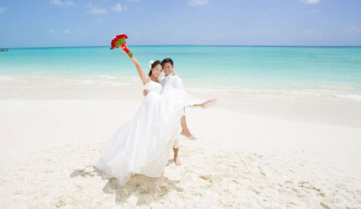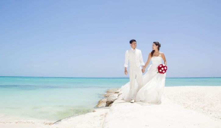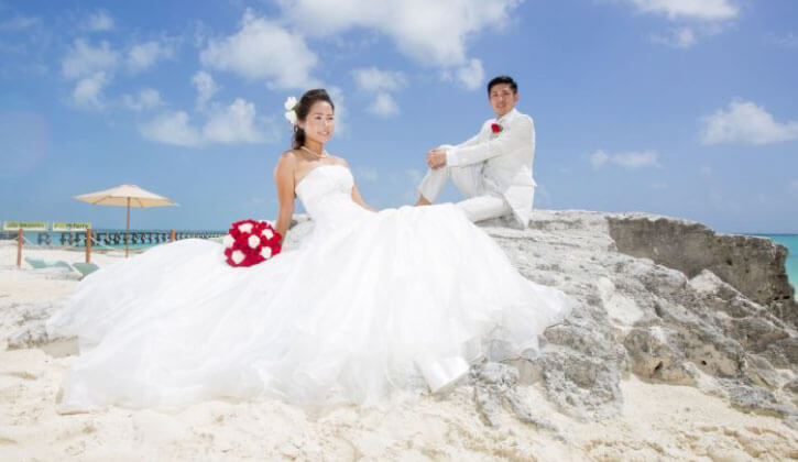 カンクン滞在ホテル敷地内のビーチフォトスポットで撮影します。約30カット撮影のデータや新婦ヘアメイク、衣裳なども含まれ、日本で衣裳の試着も可能です。